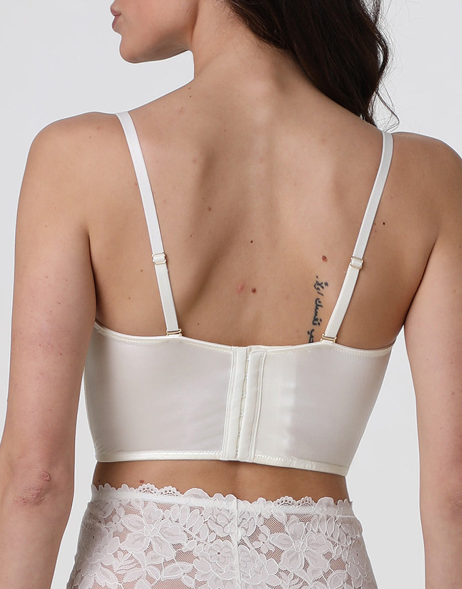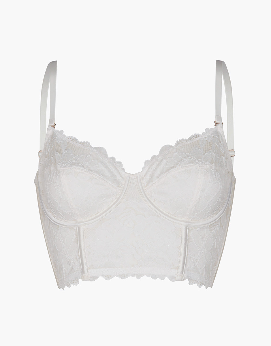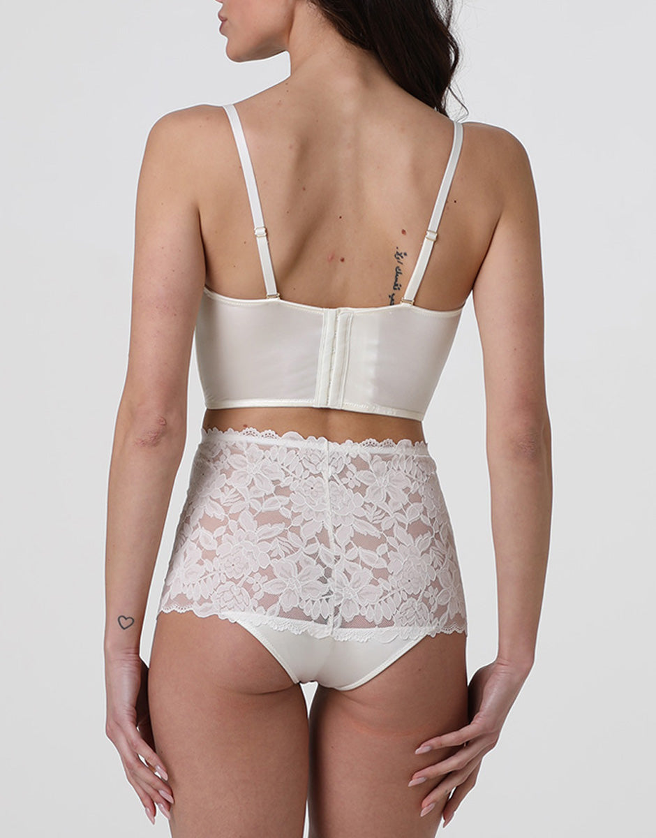 The milky white color enhances the delicacy of the lace and makes this corset ideal for elegant, romantic, and timeless intimacy.