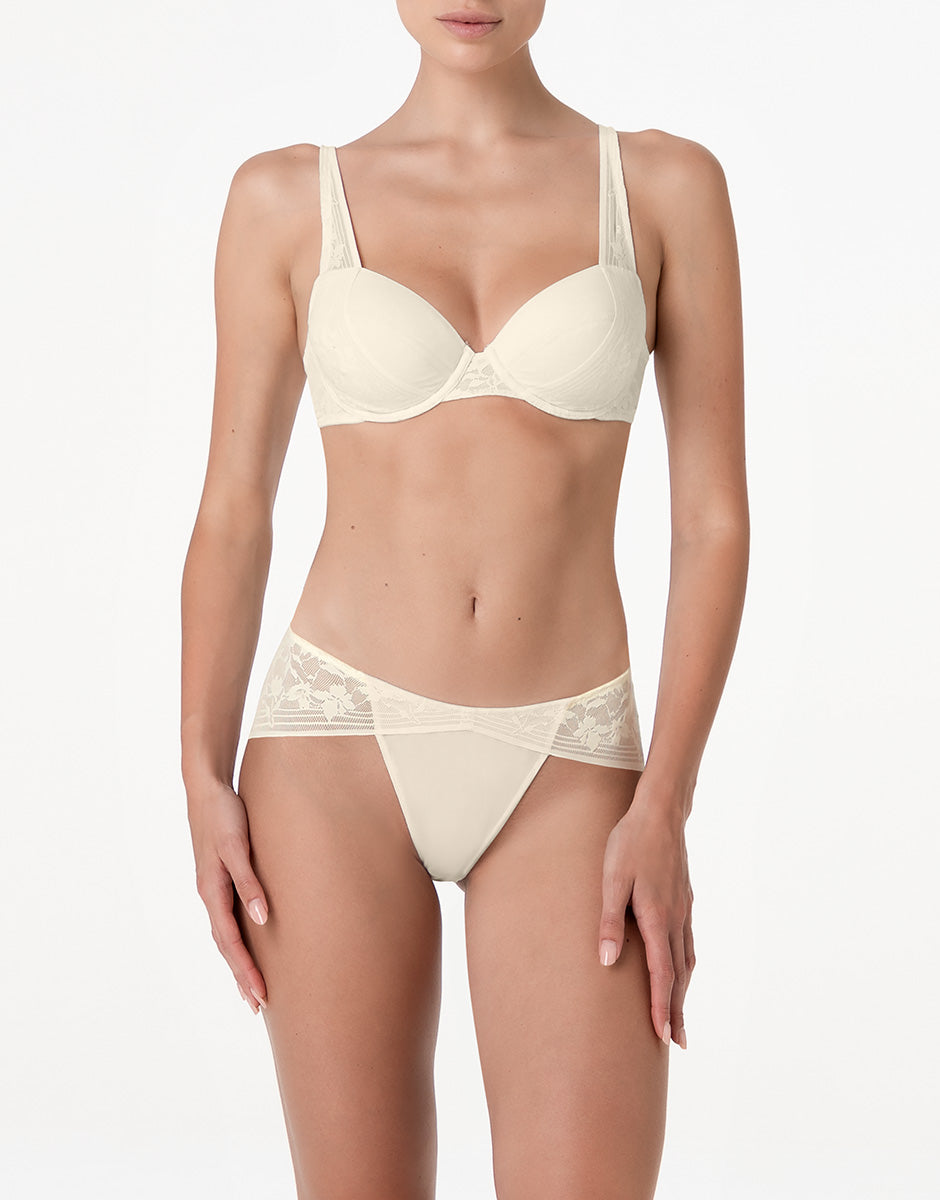 The ivory briefs from the Blossom Lace line are designed to complete the set with elegance, lightness, and femininity. The smooth microfiber front envelops the skin with an immediate feeling of comfort, while the tulle and floral lace sides and back create a refined play of transparencies that naturally enhances the silhouette.