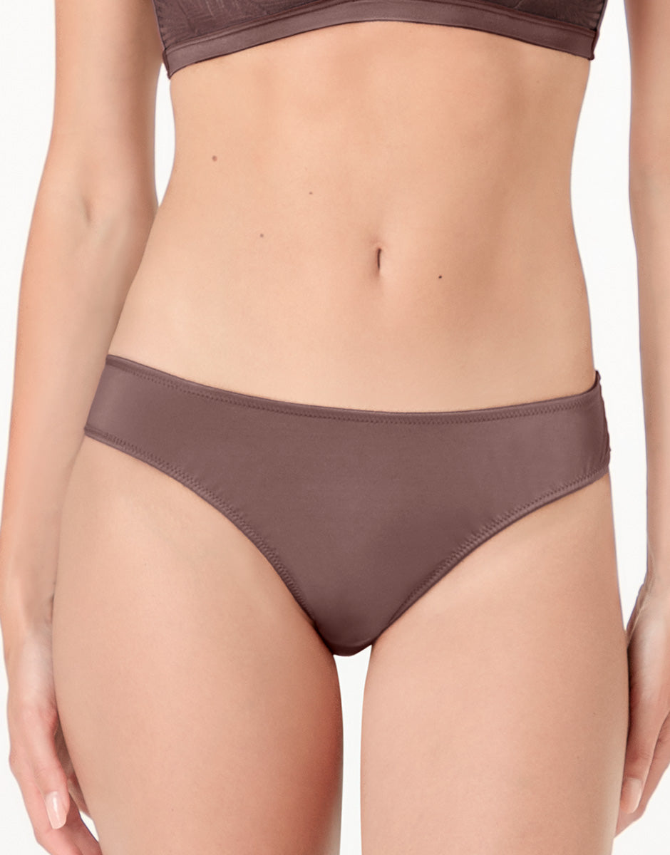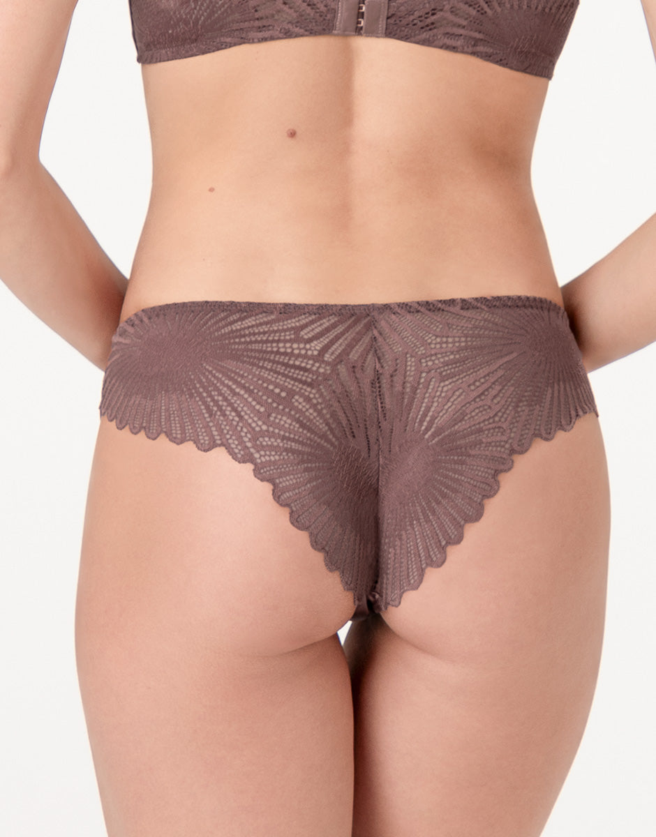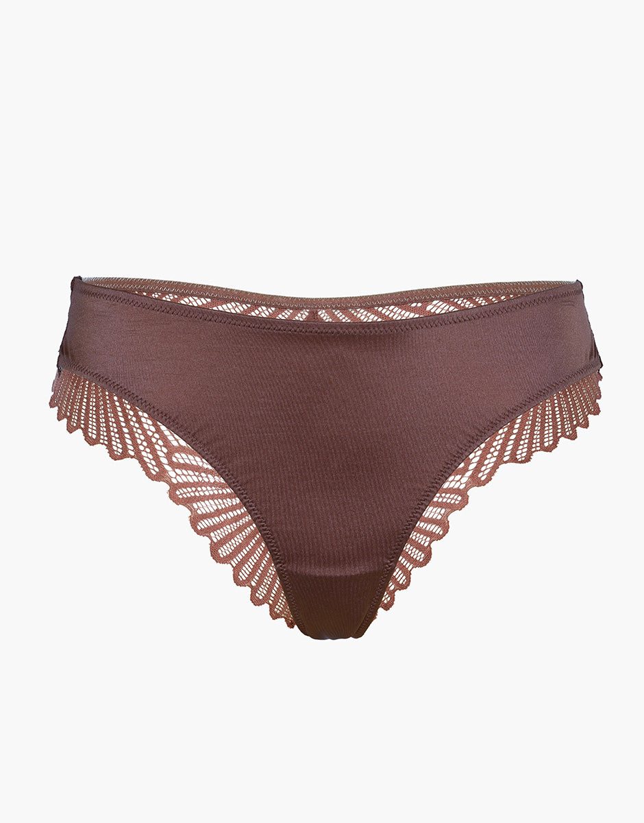 The Blowball Lacy Micro thong in hazelnut brown is designed to enhance femininity with lightness, comfort, and refined style. The shiny microfiber on the front envelops the skin with softness, offering a silky feel and a clean line that naturally adapts to the body's shape.