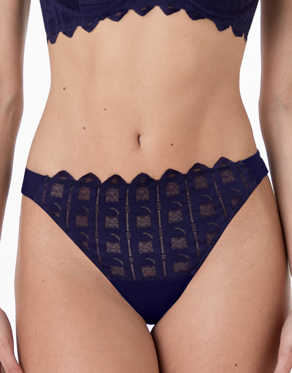 The dark purple color intensifies the character of the lace and adds depth to the design, making this Brazilian ideal for a bold, feminine, and contemporary intimate look.