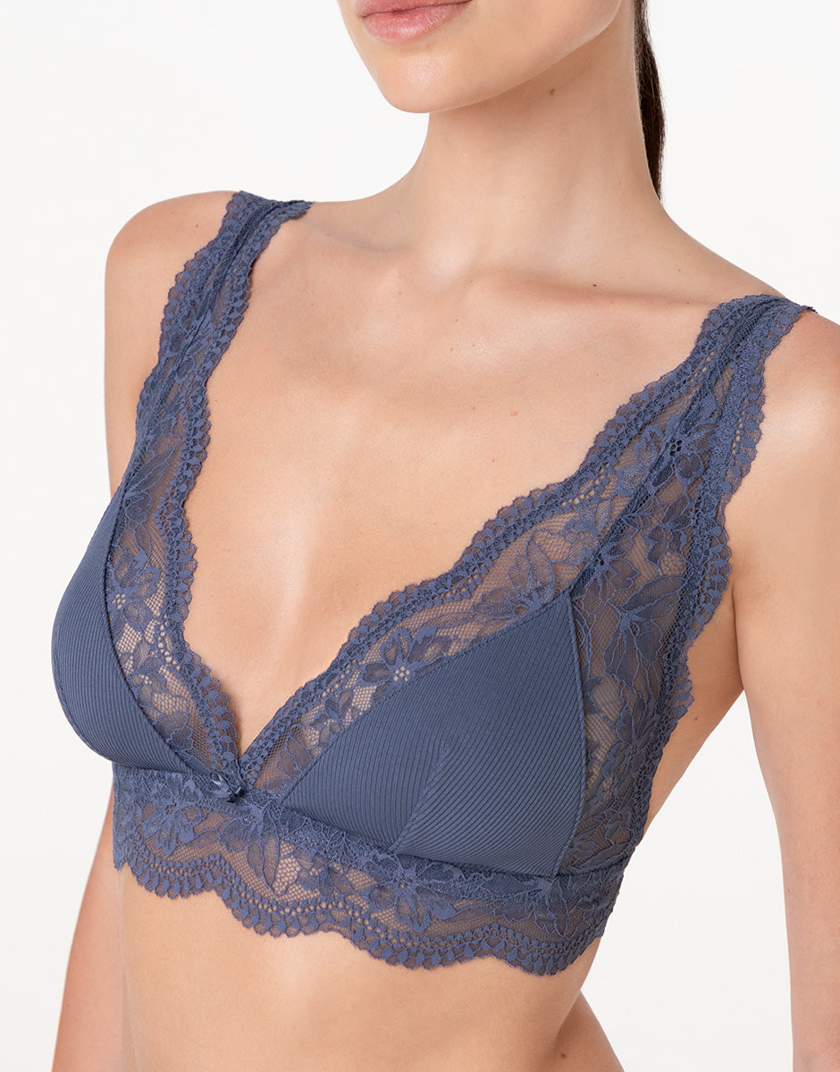 The Casual Rib Lace triangle bra in powder blue is designed to offer comfort, femininity, and a natural style, perfect for everyday wear. The ribbed microfiber cup gently envelops the bust, delicately following its shape and ensuring a light and comfortable fit.