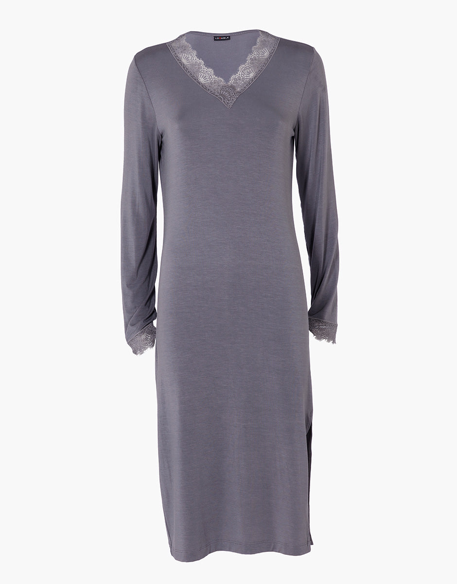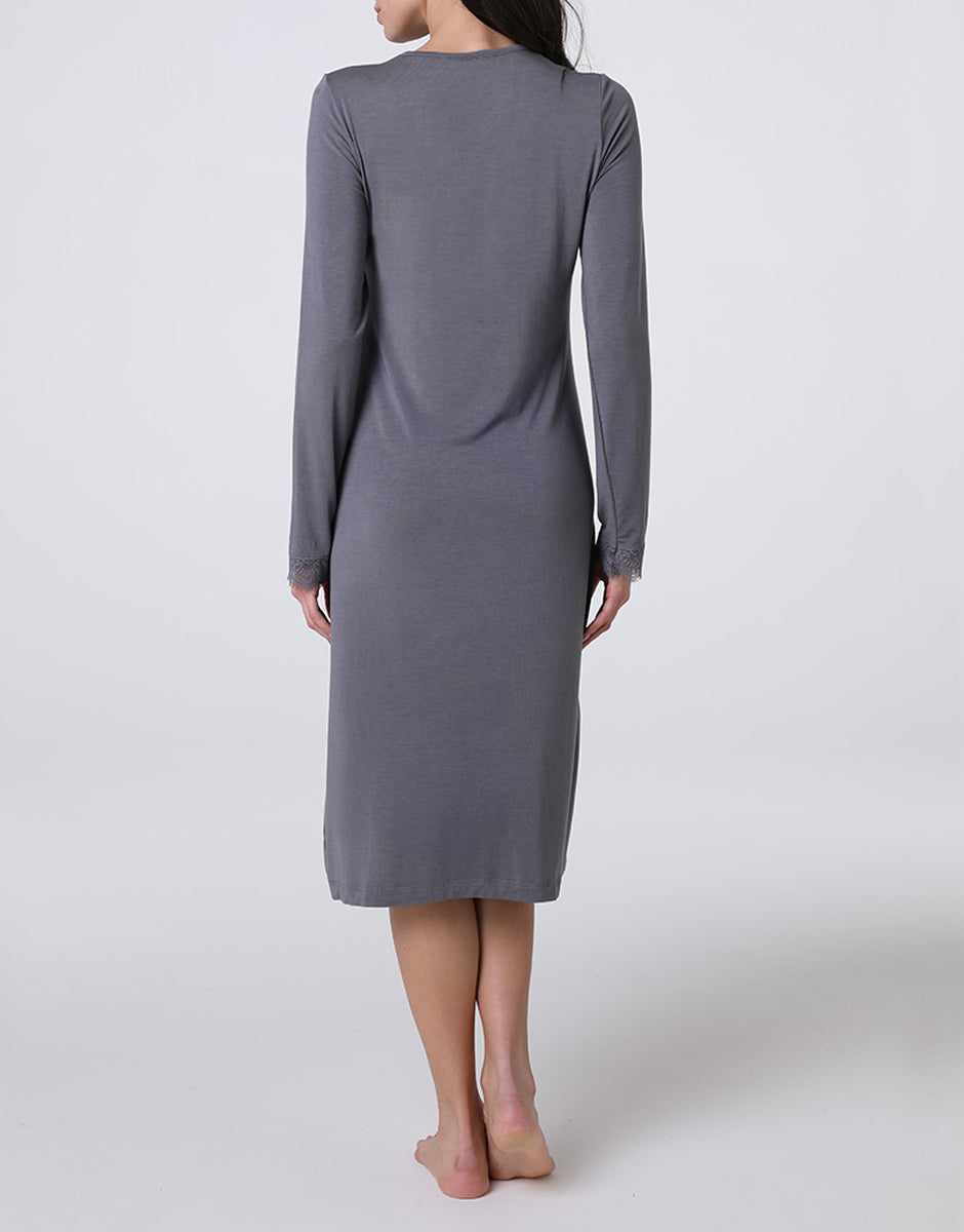 The design stands out for its V-neck and sheer lace inserts on the neckline and sleeve ends, which enrich the model with an elegant and sophisticated touch without sacrificing lightness. The midi length and side slit complete the nightgown, making it practical and feminine. Choose this modal nightgown to feel comfortable with style and delicacy, without sacrificing quality and comfort.The model is 175 cm tall and wears size S. Long-sleeved, midi-length nightgown.V-neck