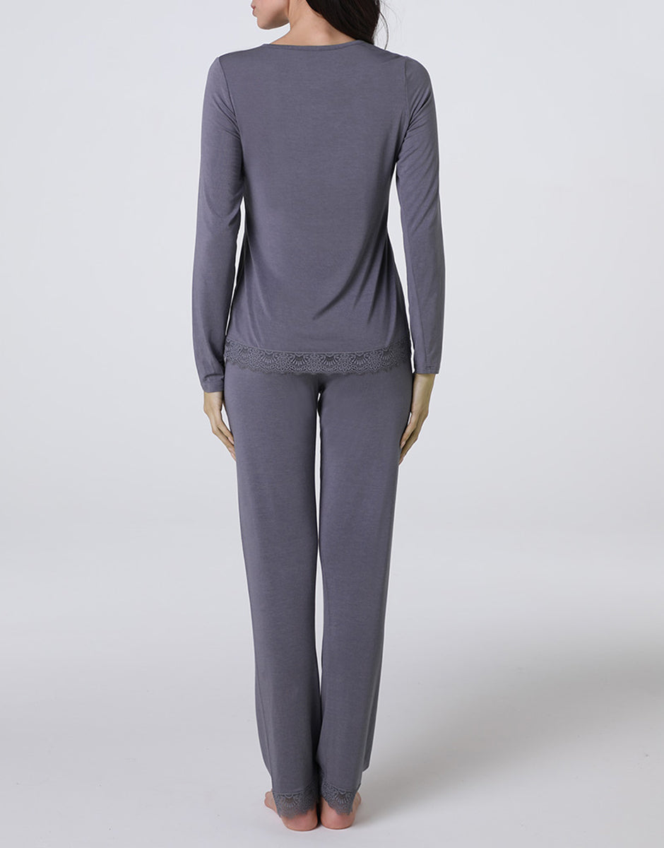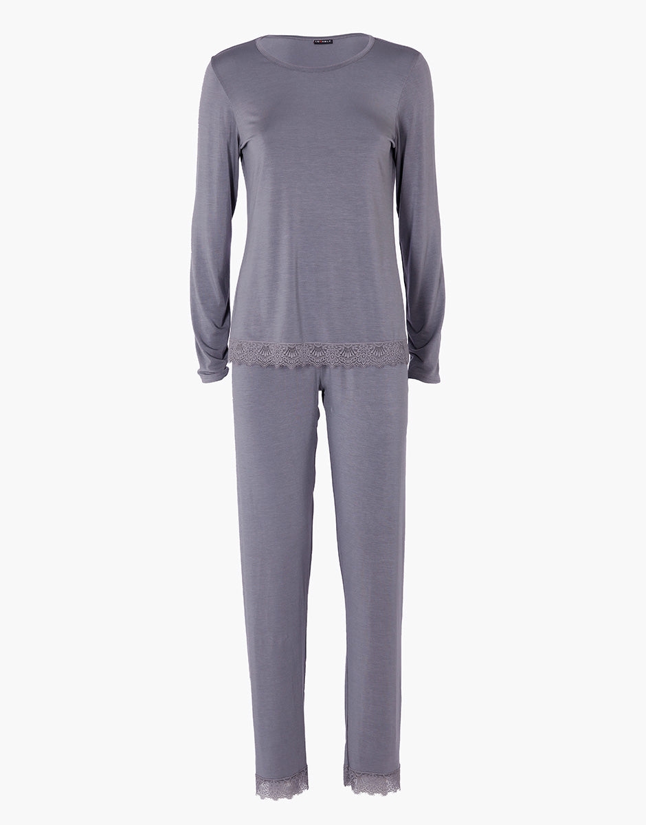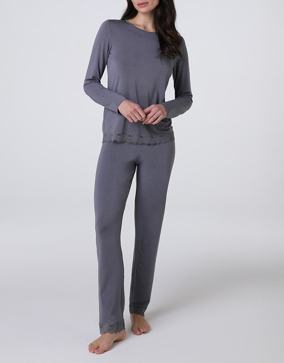 The long pajamas feature a simple and comfortable crew neck top, embellished with tone-on-tone sheer lace details at the bottom, coordinated with the lace details at the bottom of the pants. This combination of elements gives the garment a refined and delicate touch, while maintaining a practical and comfortable fit.Choose these long modal pajamas for an elegant and comfortable look, perfect for those who love quality and softness even while resting.The model is 175 cm tall and wears size S.