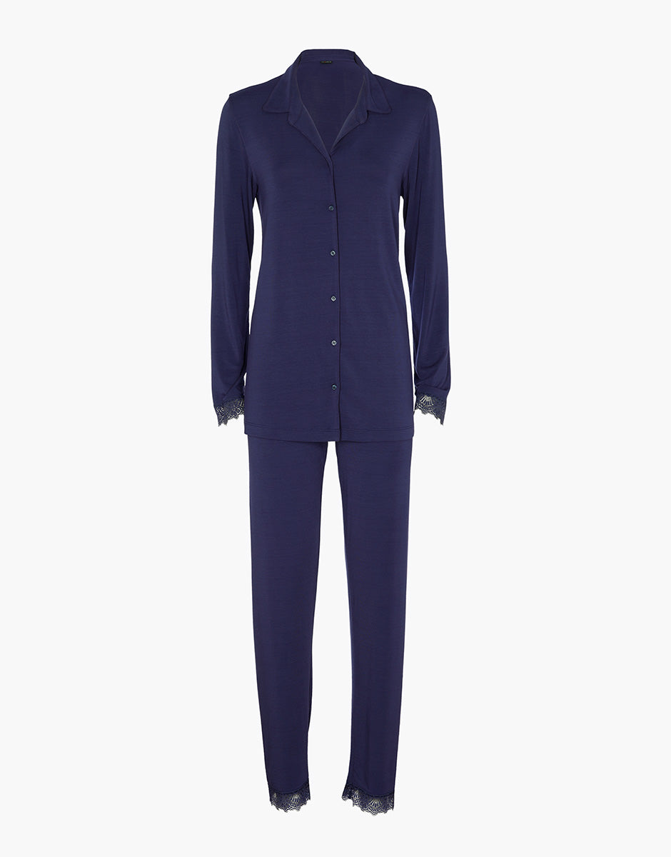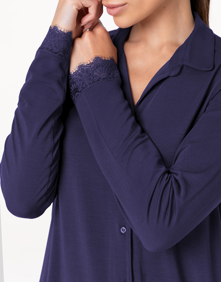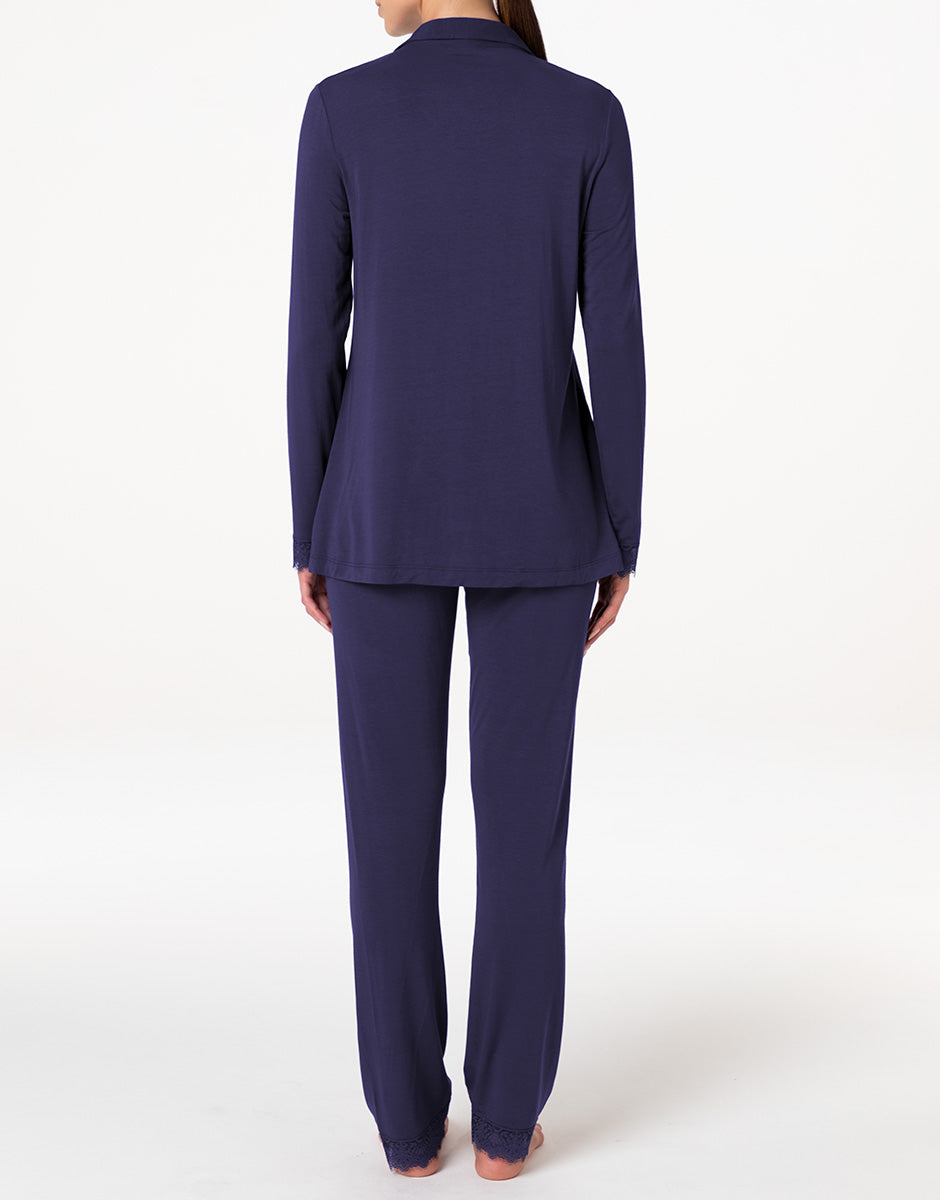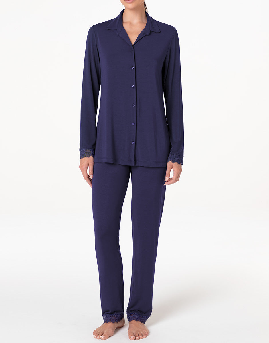 The open-front long-sleeved jacket has a clean, feminine line, embellished with lace inserts at the bottom of the sleeves that add a refined touch to the design. The matching long pants feature the same lace detail at the bottom of the leg, creating a harmonious and refined ensemble. The midnight blue color gives the pajamas an elegant and relaxing allure, making them ideal for those who love understated, feminine, and comfortable sleepwear, even when dedicating time to themselves.