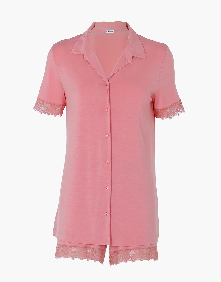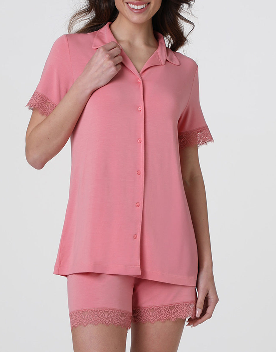 The Elegant Modal women's short pajamas in mauve pink are designed to offer a soft and light feel on the skin, combining comfort and elegance in a set with attention to detail. The stretch modal fabric is fluid, silky, and pleasant to the touch, ideal for moments of relaxation and warmer nights. The short-sleeved jacket, with a front button closure, has a soft and feminine line, enriched with delicate lace inserts at the bottom of the sleeves that add a refined and romantic touch. The matching shorts feature the same lace detail at the hem, creating a harmonious and elegant ensemble. The mauve pink color gives the set a delicate and luminous allure, perfect for those who love refined, feminine, and comfortable sleepwear, even in the most intimate moments.