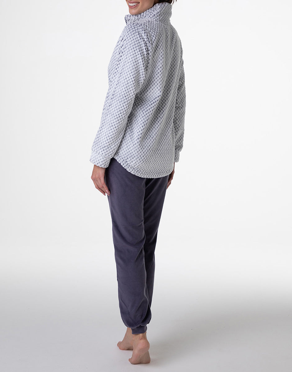 The pants in soft dark gray microfleece complete the look, offering a pleasant feel on the skin and freedom of movement. The welt pockets add practicality, while the cuffs at the bottom of the legs retain heat and add a cozy touch.