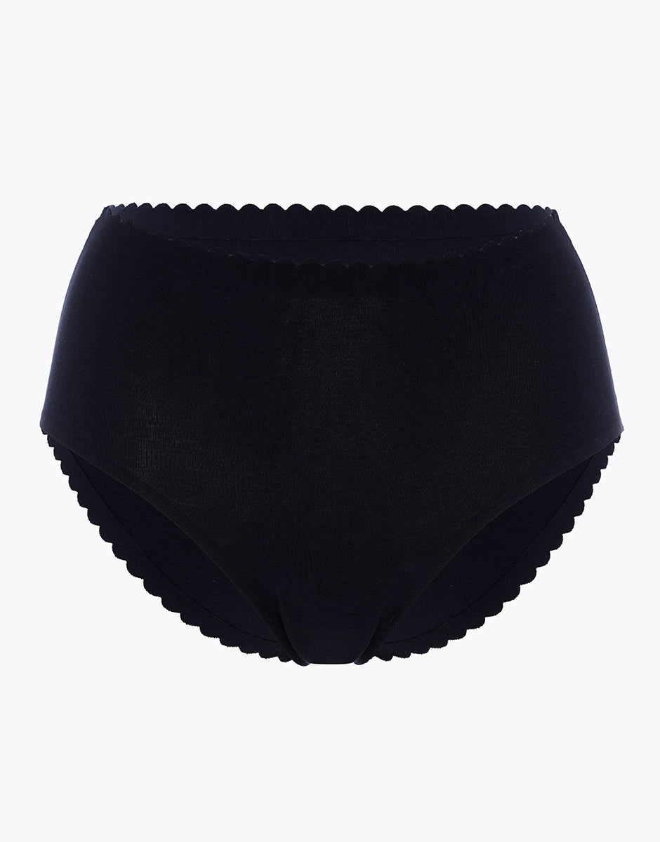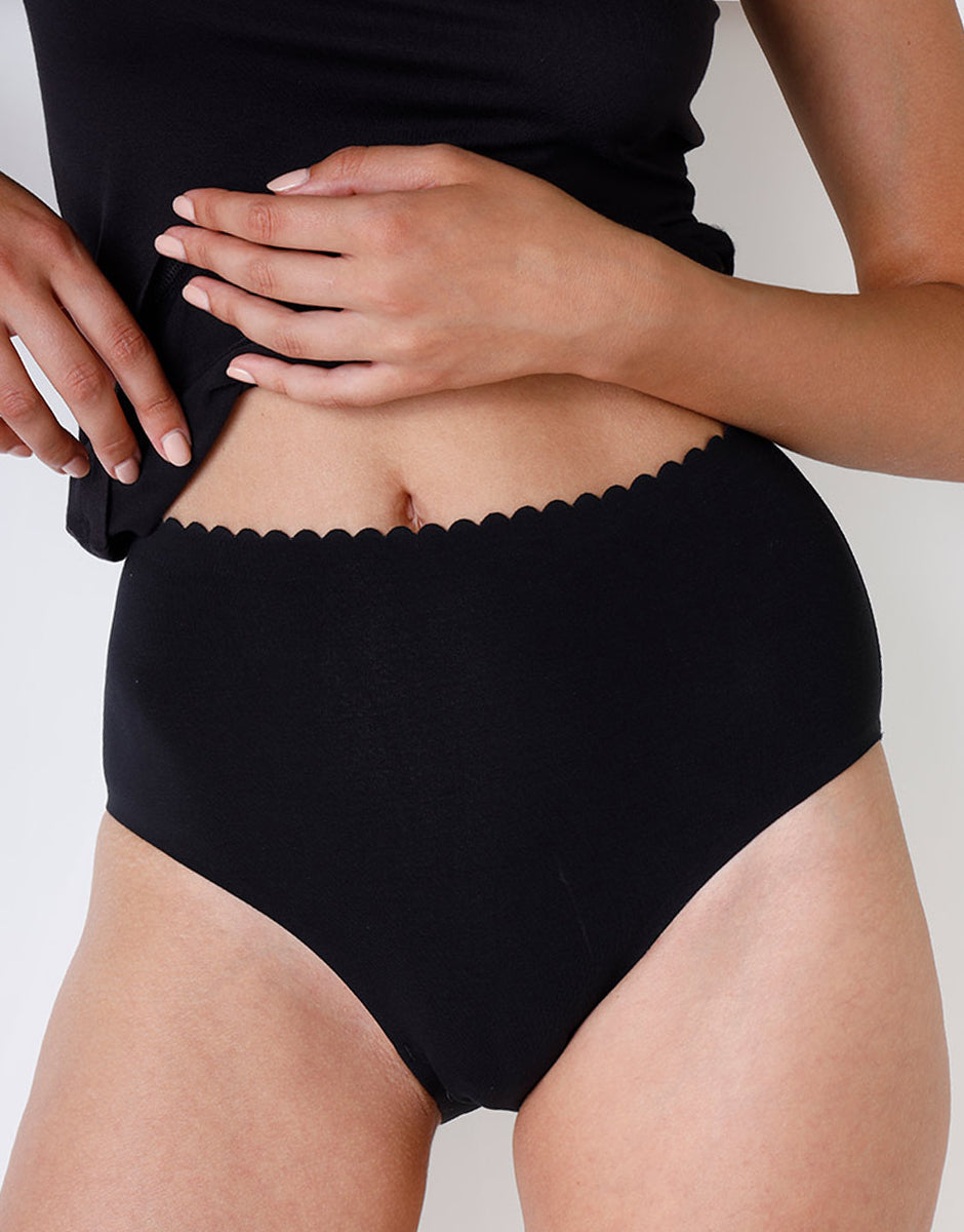 The gusset, made from 100% cotton, ensures comfort and breathability, keeping your skin cool and dry all day long. Experience the perfection of invisible underwear with our Softness High-Waisted Briefs, designed to make you feel good about yourself on every occasion. Buy now for a feeling of lightness and style that will accompany you everywhere.The model is 175 cm tall and wears size S. Front and back in stretch cotton.No elasticated waistband or leg openings, with raw-cut finish and adhesive reinforcement. Scalloped pattern on the waistband and back leg opening. 100% cotton gusset. Please note: We recommend consulting the Size Guide on the product page to ensure you purchase the correct size for you.