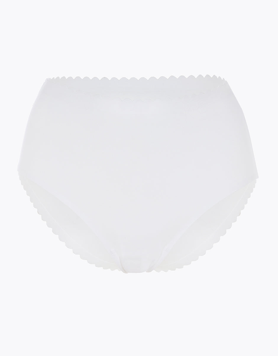 The gusset, made from 100% cotton, ensures comfort and breathability, keeping your skin cool and dry all day long. Experience the perfection of invisible underwear with our Softness High-Waisted Briefs, designed to make you feel good about yourself on every occasion. Shop now for a feeling of lightness and style that will accompany you everywhere. The model is 175 cm tall and wears size S.Stretch cotton front and back. No elasticated waistband or leg openings, with raw-cut finish and adhesive reinforcement.Scalloped pattern on waistband and back leg opening