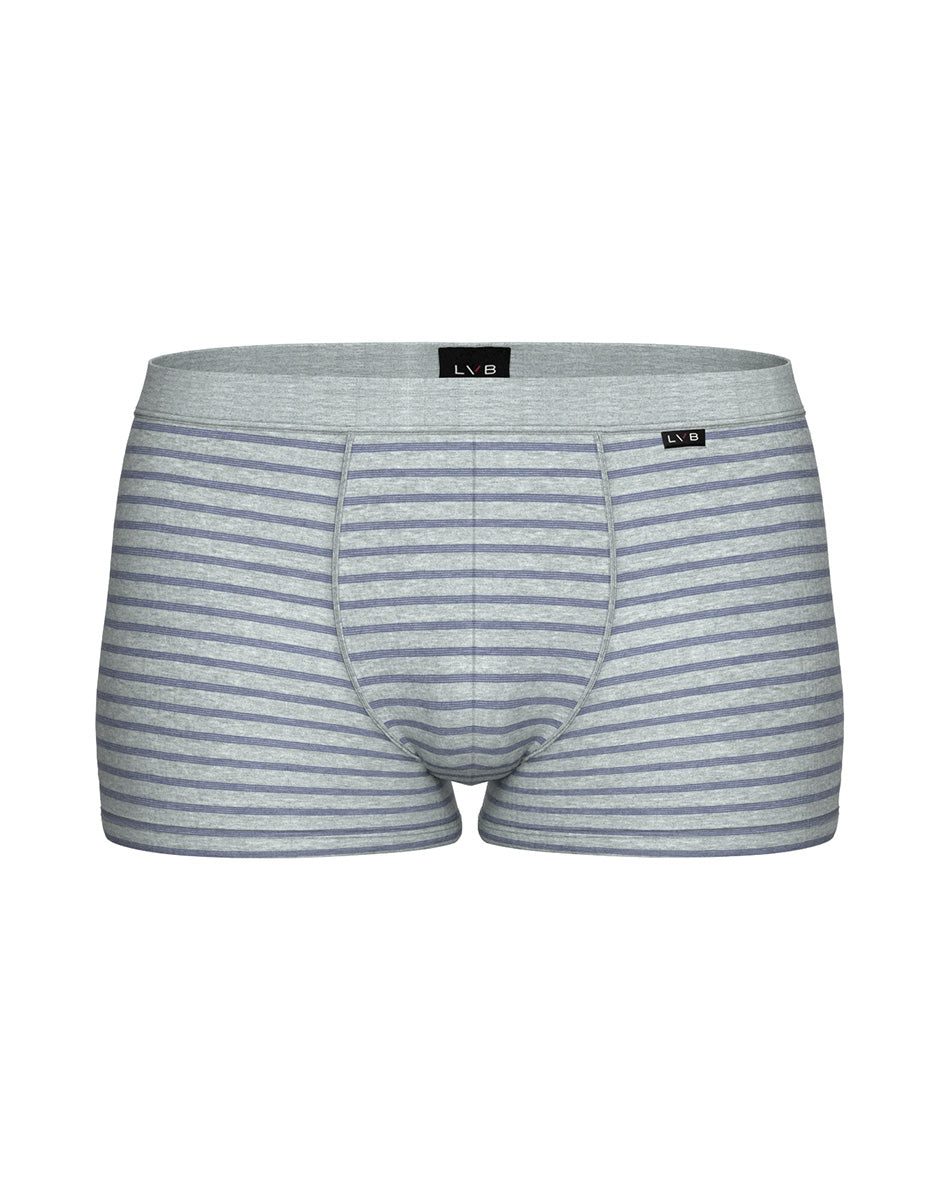 The yarn-dyed finish and two-tone striped design in heather gray and air force blue give this model a clean and neat style. The mélange fabric defines the color and makes the garment easy to wear every day. The covered elastic waistband in solid gray ensures comfort, while the LVB label on the front completes the design with an essential detail.