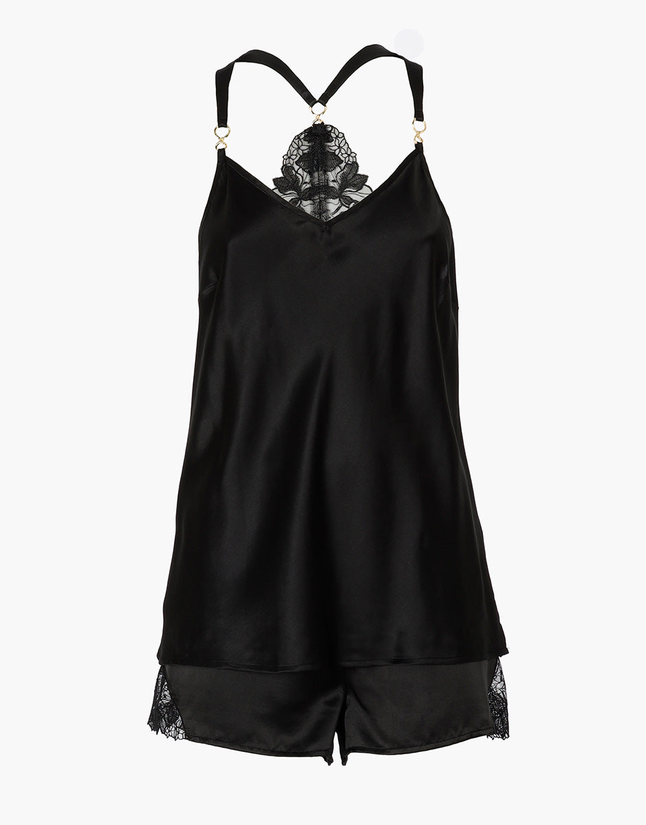 The model is 175 cm tall and wears size S.Silk and modal top and shorts set. Lace insert on the back and in the slit of the shorts. Thin straps with metal accessories. Smooth waist at the front and gathered at the back.Smooth waist at the front and gathered at the back PLEASE NOTE: We recommend consulting the Size Guide on the product page to ensure you purchase the correct size for you.