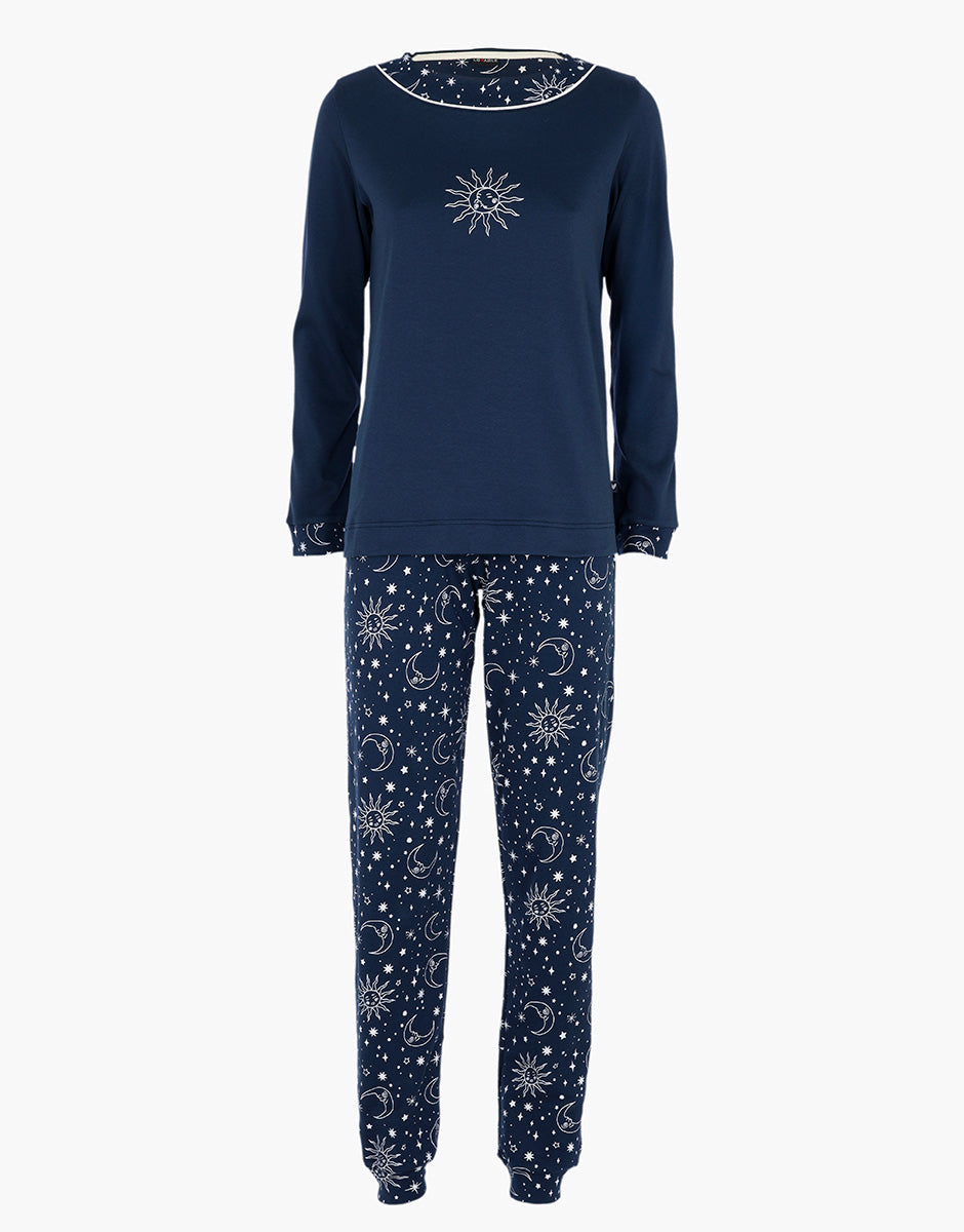 Warm and comfortable women's long pajamas, perfect for relaxing in style at home. The navy blue soft interlock crew neck top is decorated with a print on the chest and finished with cuffs and a crew neck matching the pants, for a harmonious and feminine look. The long pants with cuffs at the bottom ensure comfort and practicality while resting, completing the outfit with style. This long cotton pajama set for women combines softness, warmth, and thoughtful design, ideal for moments of comfort and well-being at home.