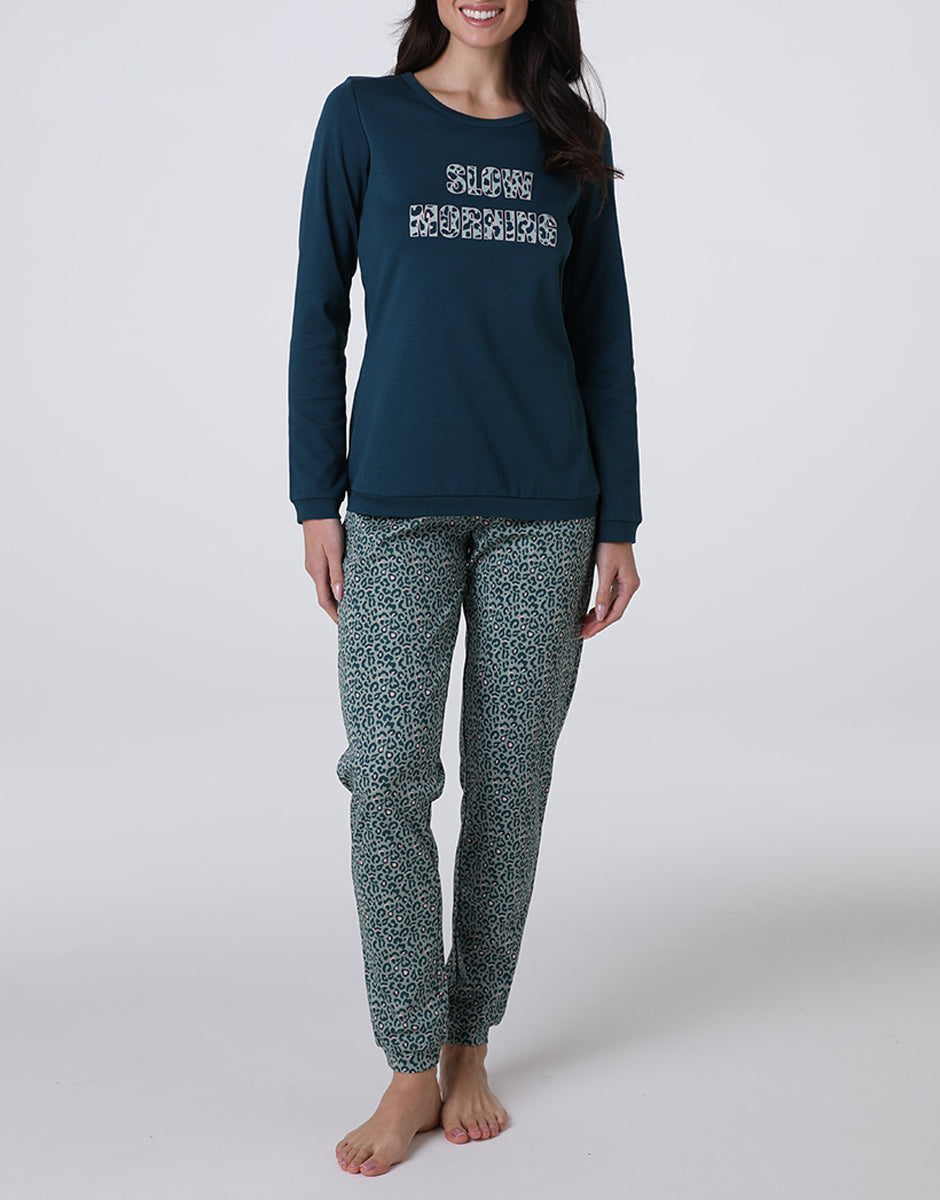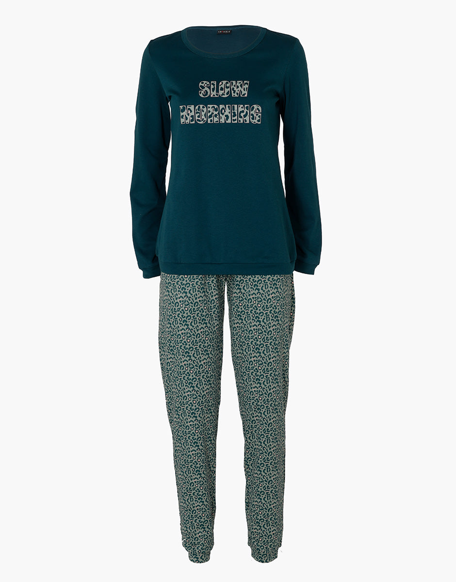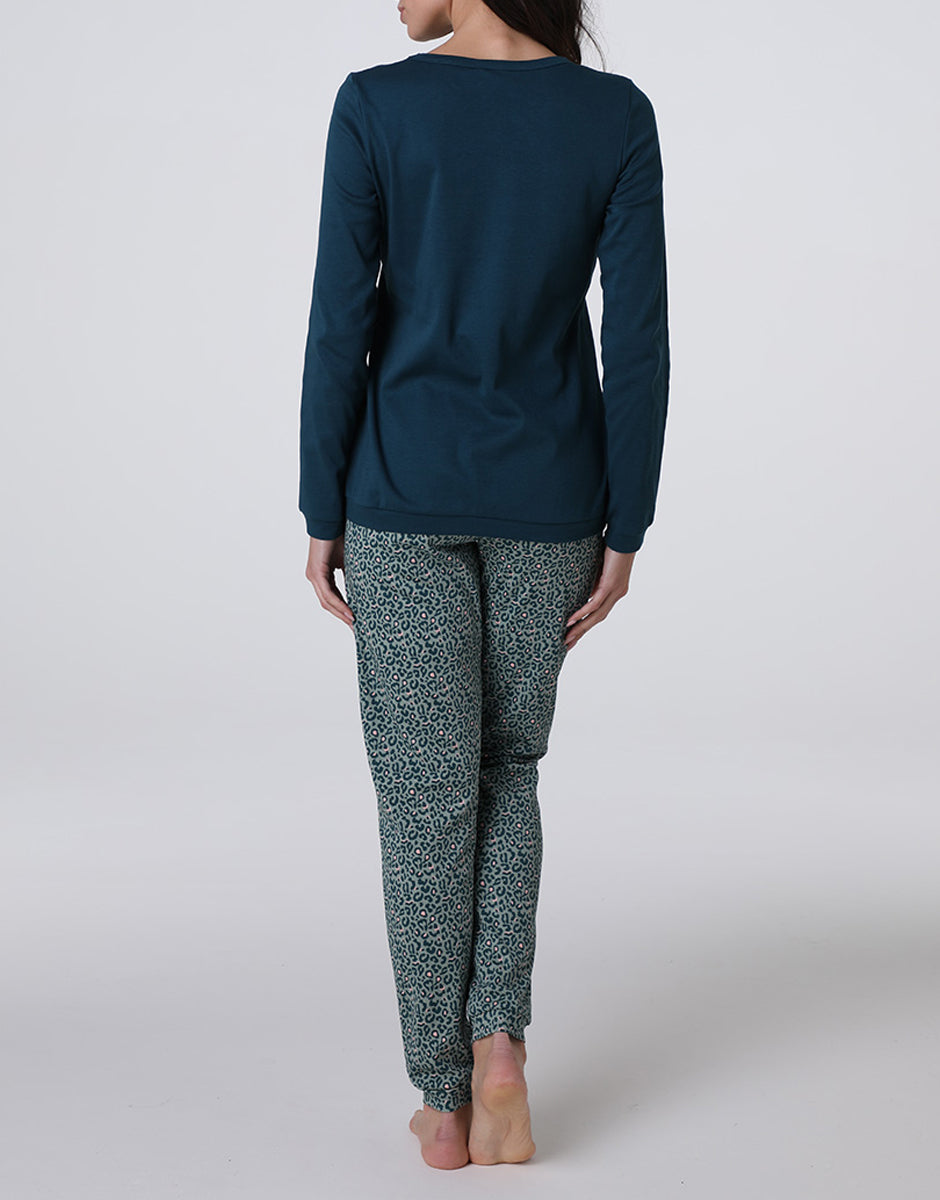 Wrap yourself in the softness of these long interlock pajamas in pure cotton, perfect for relaxing on cooler evenings. The crew neck top, in solid teal, is embellished with a front print that echoes the pattern on the pants, for a coordinated and refined touch. The cuffs at the bottom of the sleeves complete the garment with a comfortable and practical finish.The pants, with a delicate animal print in the same shades, feature a contrasting drawstring and cuffs at the bottom of the legs, designed to offer a comfortable and stable fit throughout the night.Pajamas in warm interlock cotton, designed to guarantee comfort and freedom during your moments of rest.The model is 175 cm tall and wears size S.Long-sleeved crew neck shirt with placed print. Long printed pants with contrasting drawstring. Cuffs on shirt and pants.Composition: 100% cotton (CO)