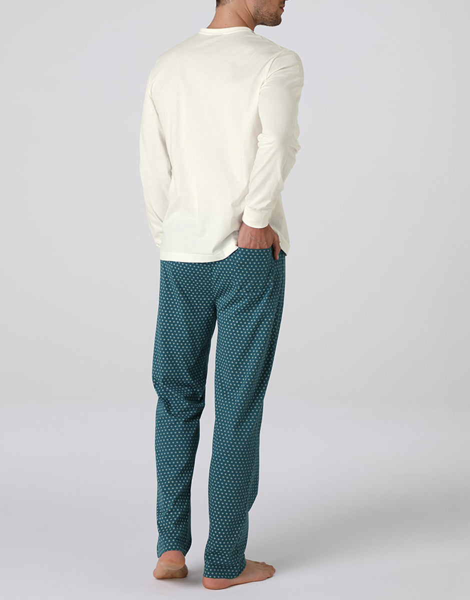 The long-sleeved shirt, in ivory, features a V-neck with contrasting color trim and cuffs on the sleeves. LVB embroidery on the chest adds a simple detail to the garment. The long green printed pants complete the set. The adjustable drawstring waist allows you to adjust the fit, while the patch pocket on the back adds practicality. The LVB embroidery on the sides echoes that of the shirt.