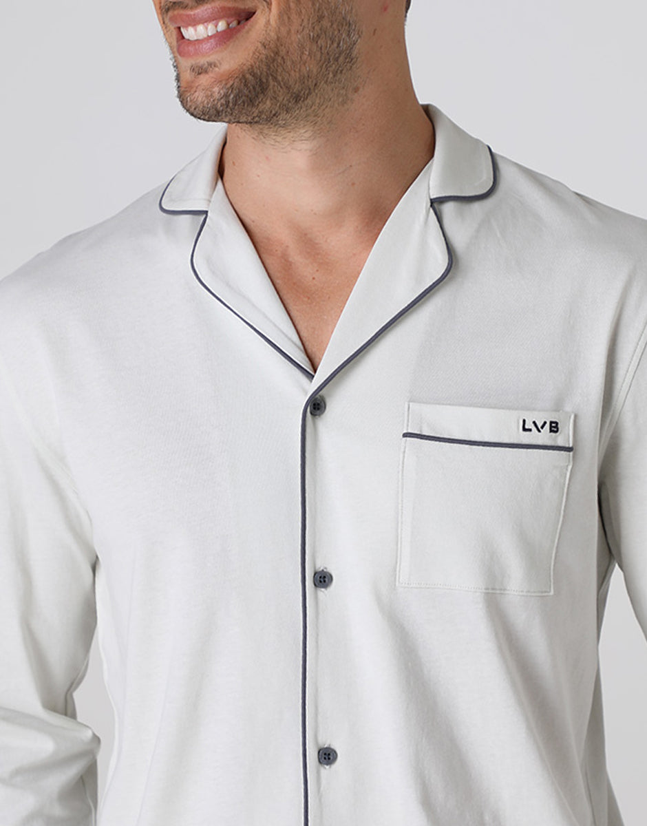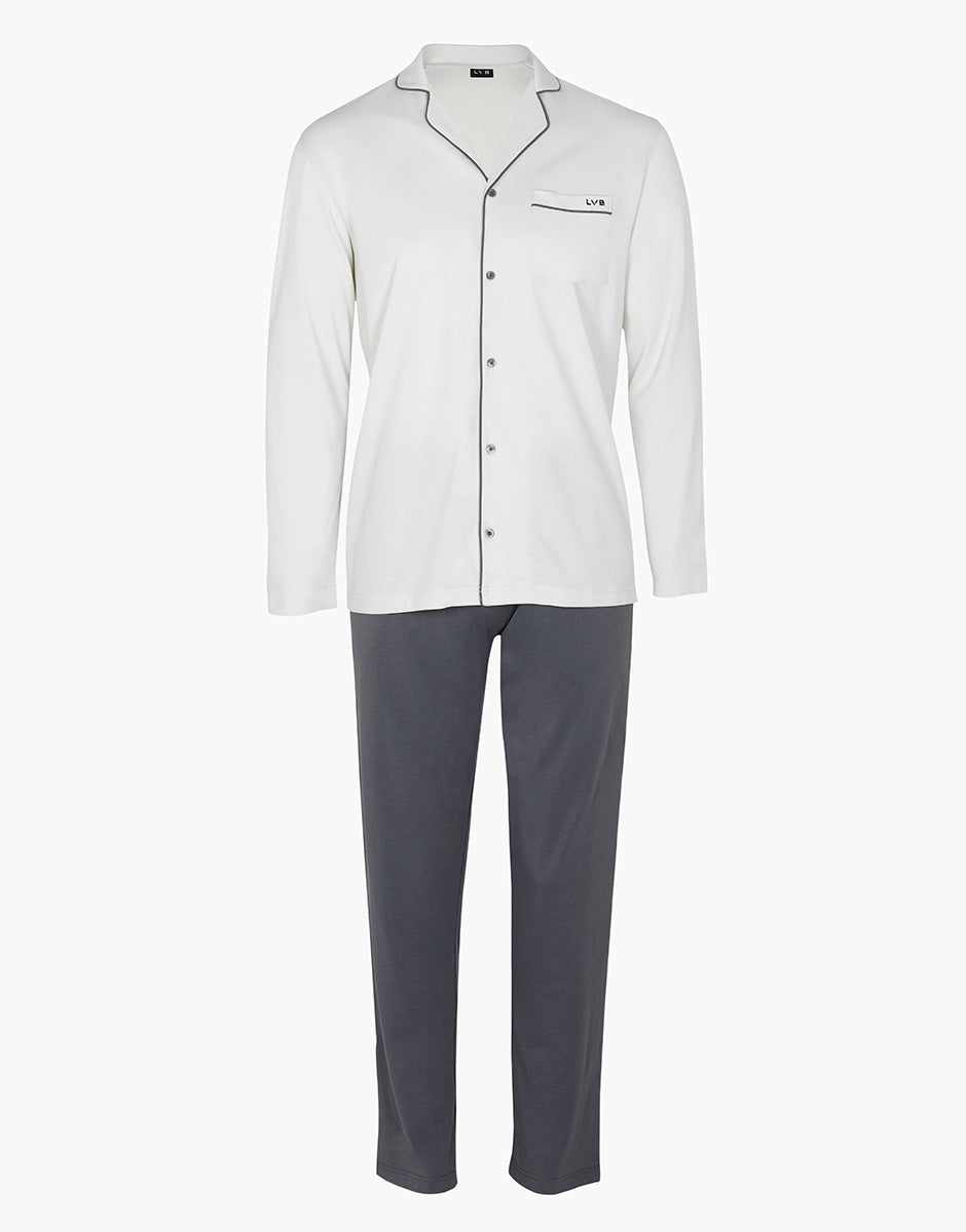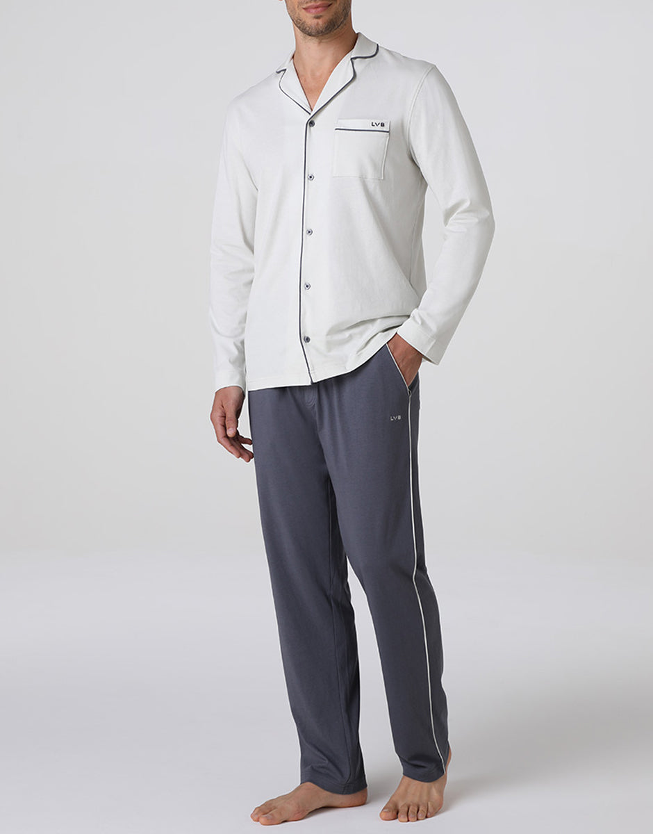 These men's long pajamas in cotton jersey are designed to offer natural comfort and practicality when relaxing. The cotton fabric is soft, breathable, and pleasant against the skin, ideal for nighttime and relaxing at home. The patch pocket on the chest with LVB embroidery adds an essential graphic detail. The dark gray long pants complete the set with a balanced contrast. The adjustable drawstring waist allows you to adjust the fit, while the side pockets with LVB logo make the garment practical for everyday use. A comfortable and well-balanced pajama set, designed to accompany rest with simplicity and quality.