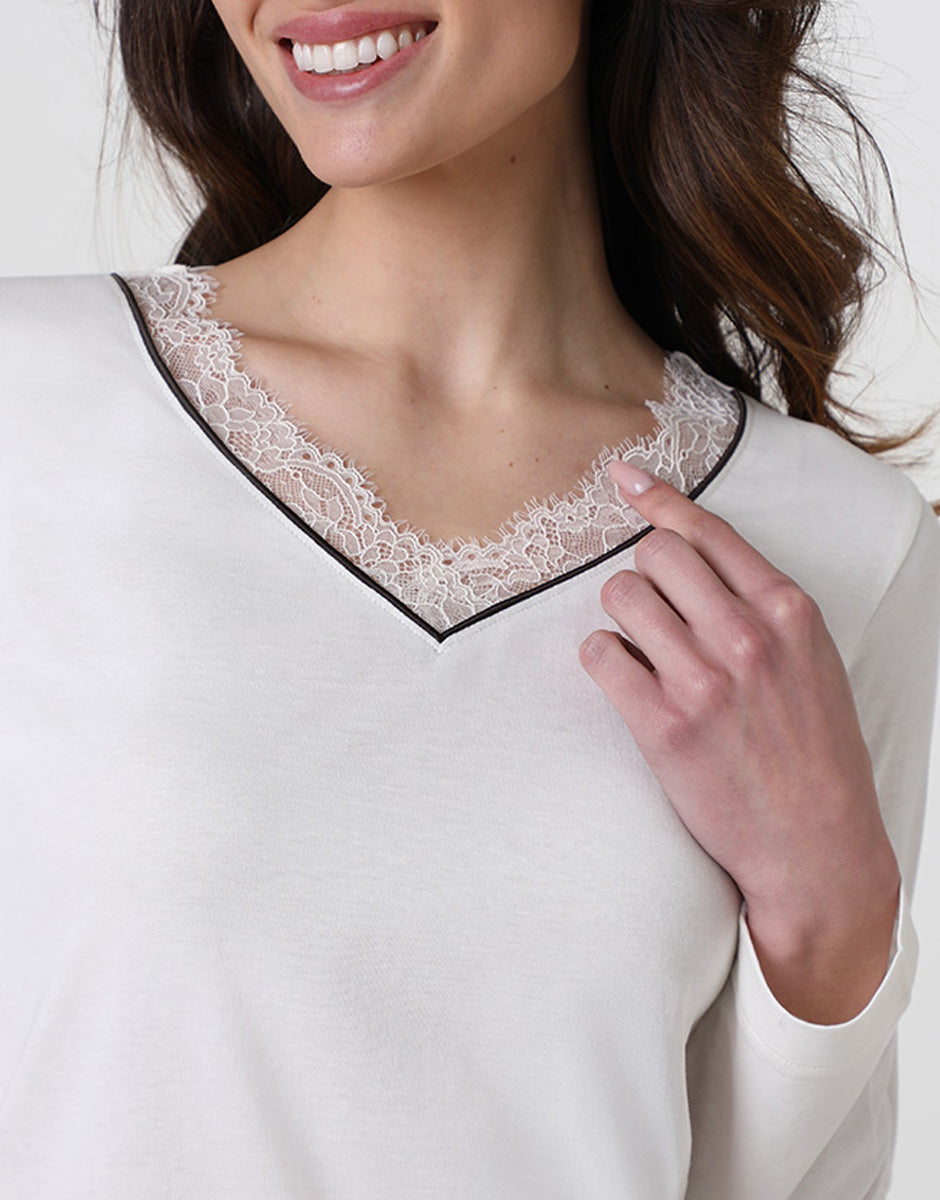 These women's long pajamas are designed to combine natural comfort and refined elegance, ideal for resting in lightness and style. The modal cotton knit, in solid milk white, envelops the skin with a soft and breathable feel, perfect for moments of relaxation.
