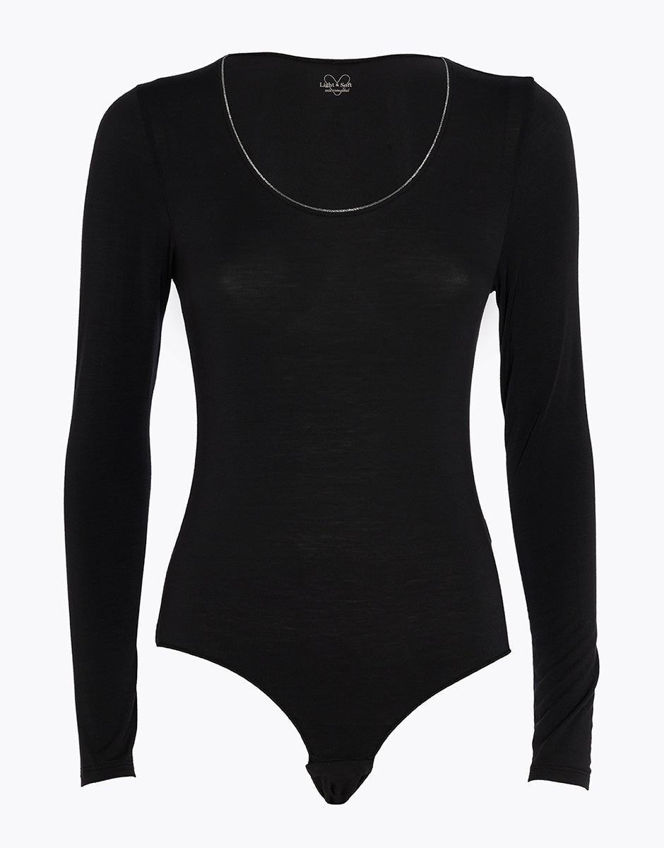 Long Sleeve Bodysuit with Wide Round Neckline in Micromodal, black