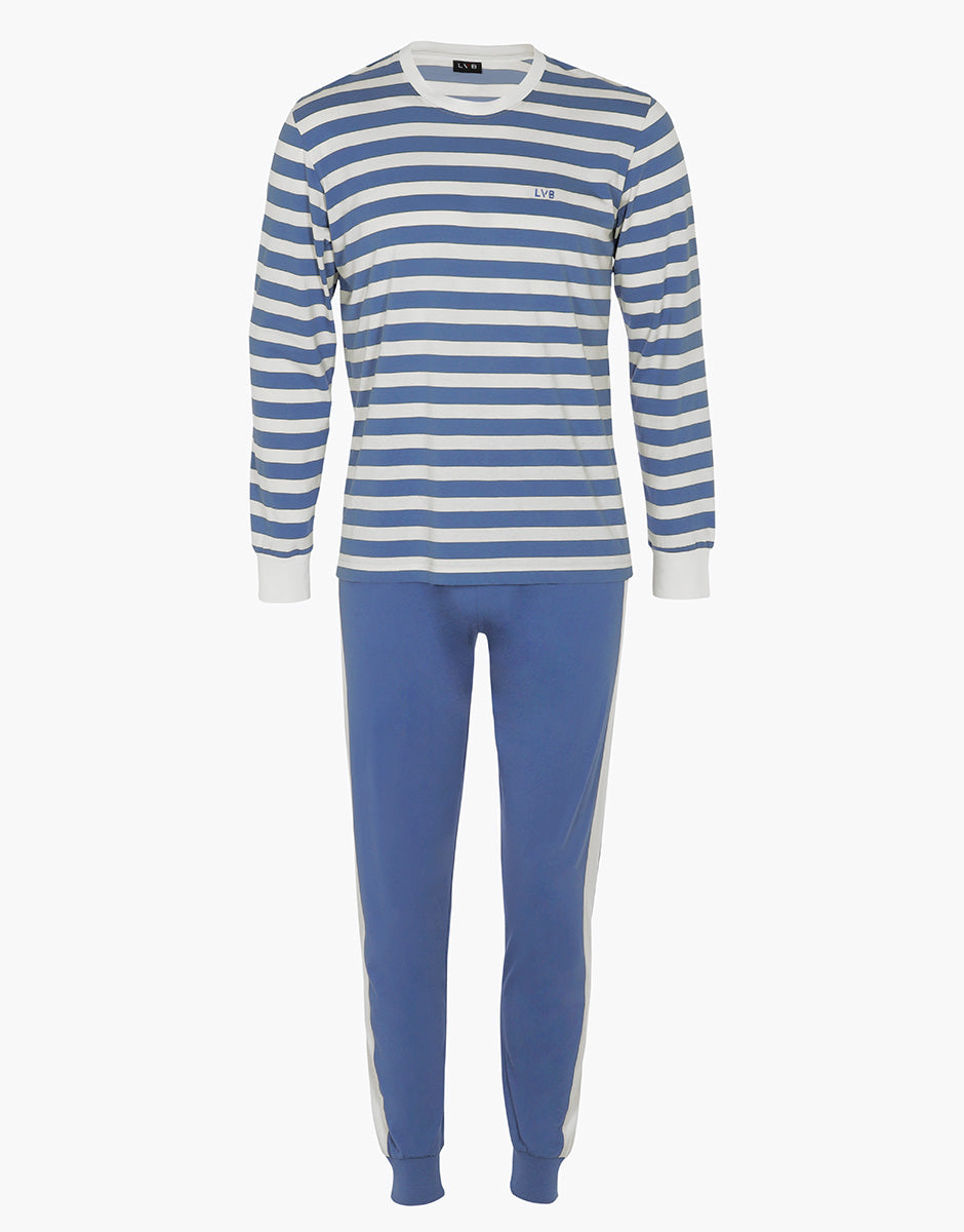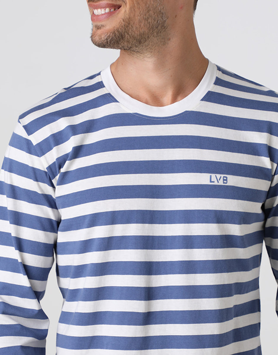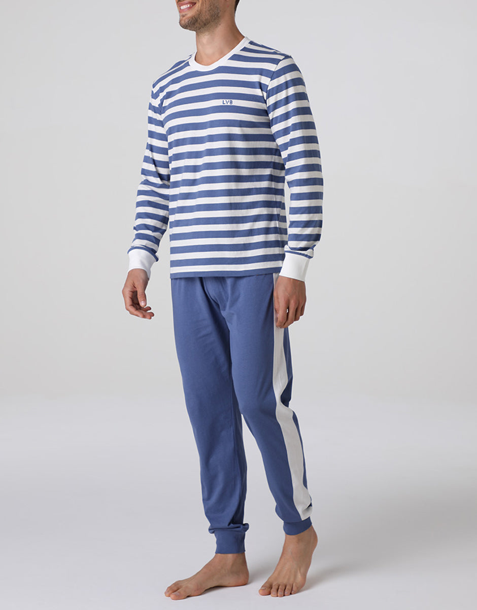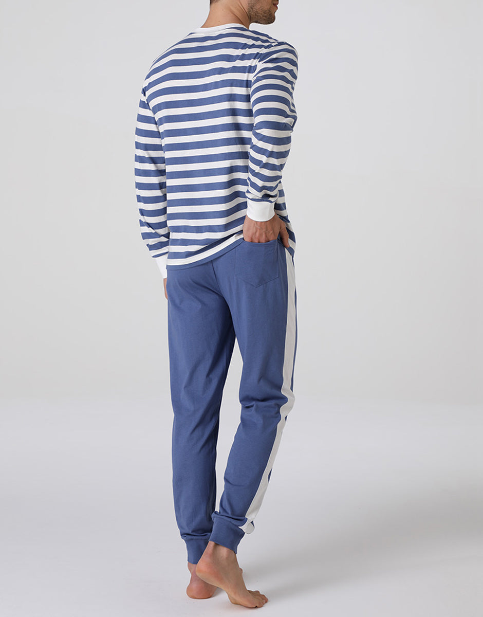 These men's long jersey pajamas are ideal for resting and relaxing at home. The long-sleeved shirt features an ivory and blue striped print, with an ivory crew neck and cuffs that define a clean, easy-to-wear line.