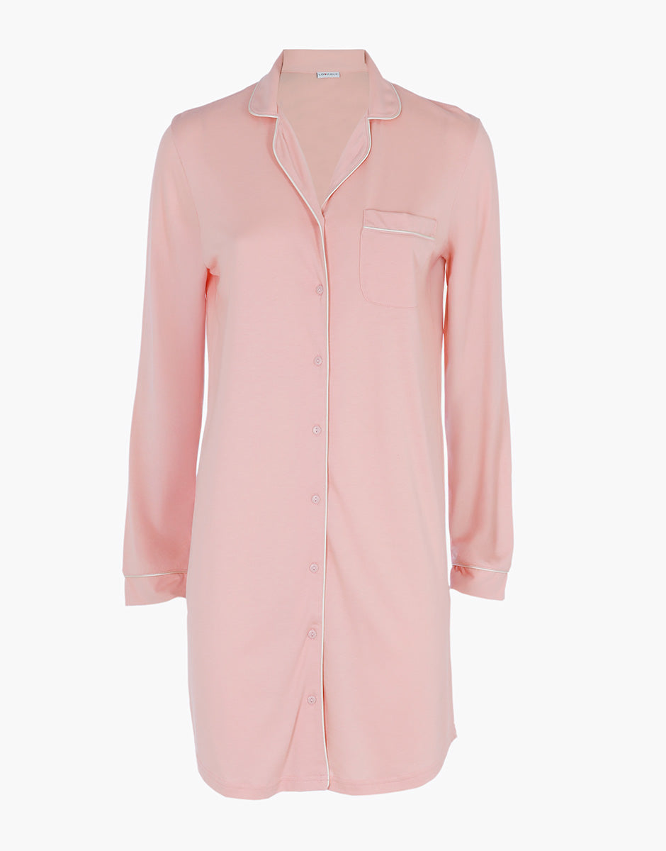 Wrap yourself in the softness of this long-sleeved open nightgown, made from a refined blend of cotton and modal, designed to keep you cool and comfortable while you sleep. The delicate vintage pink is embellished with elegant ivory-colored piping, adding a touch of femininity and timeless sophistication.The design is completed by a practical patch pocket on the chest and a rounded hem that ensures a fluid and comfortable fit, ideal for accompanying you on your evenings and nights of relaxation with style and comfort.Treat yourself to maximum comfort and femininity for your evenings: choose this modal cotton nightgown and turn every moment of relaxation into a stylish experience.The model is 175 cm tall and wears size S. Open nightgown with buttons.Contrasting ivory piping