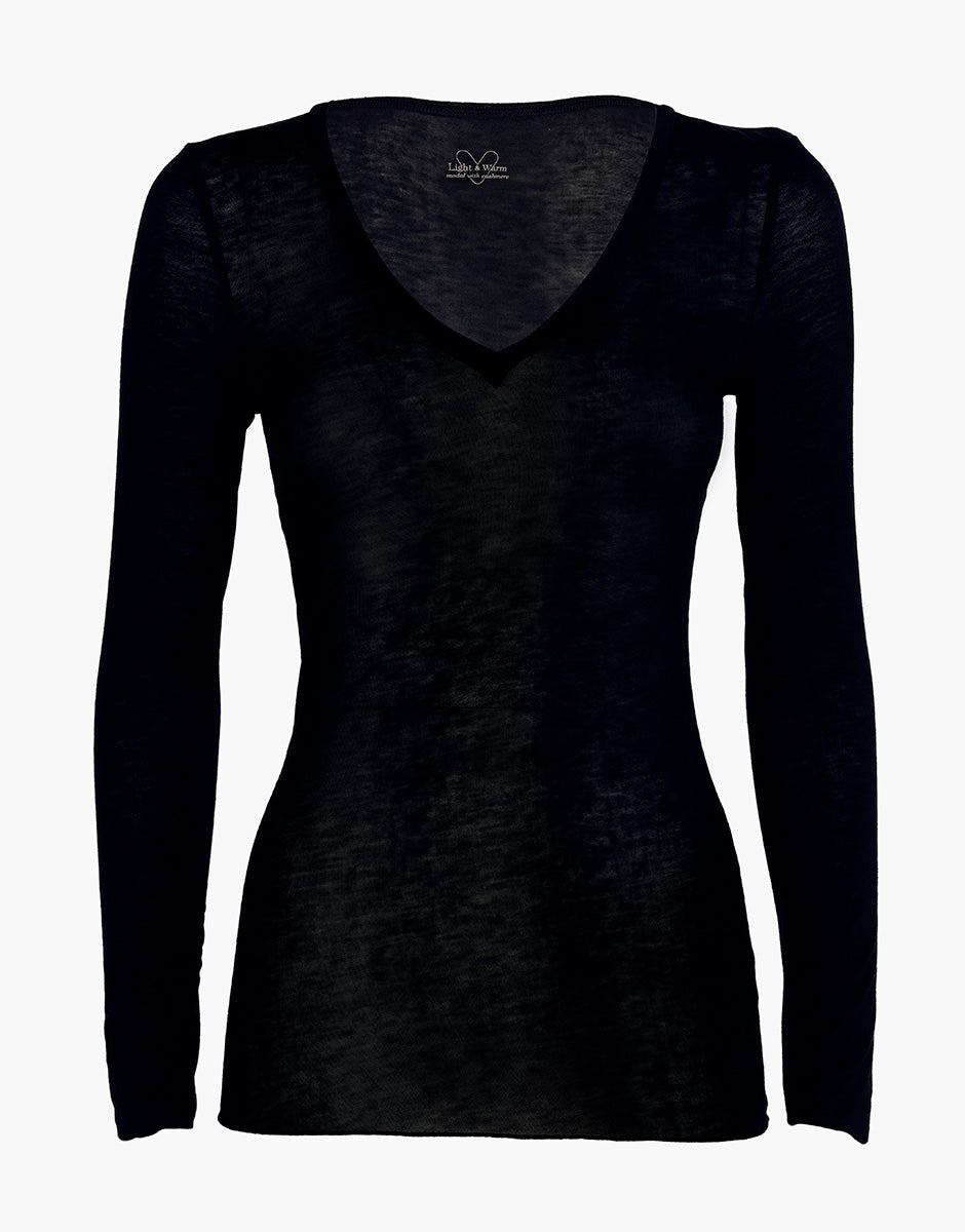 Long-sleeved V-neck sweater in modal and cashmere, black