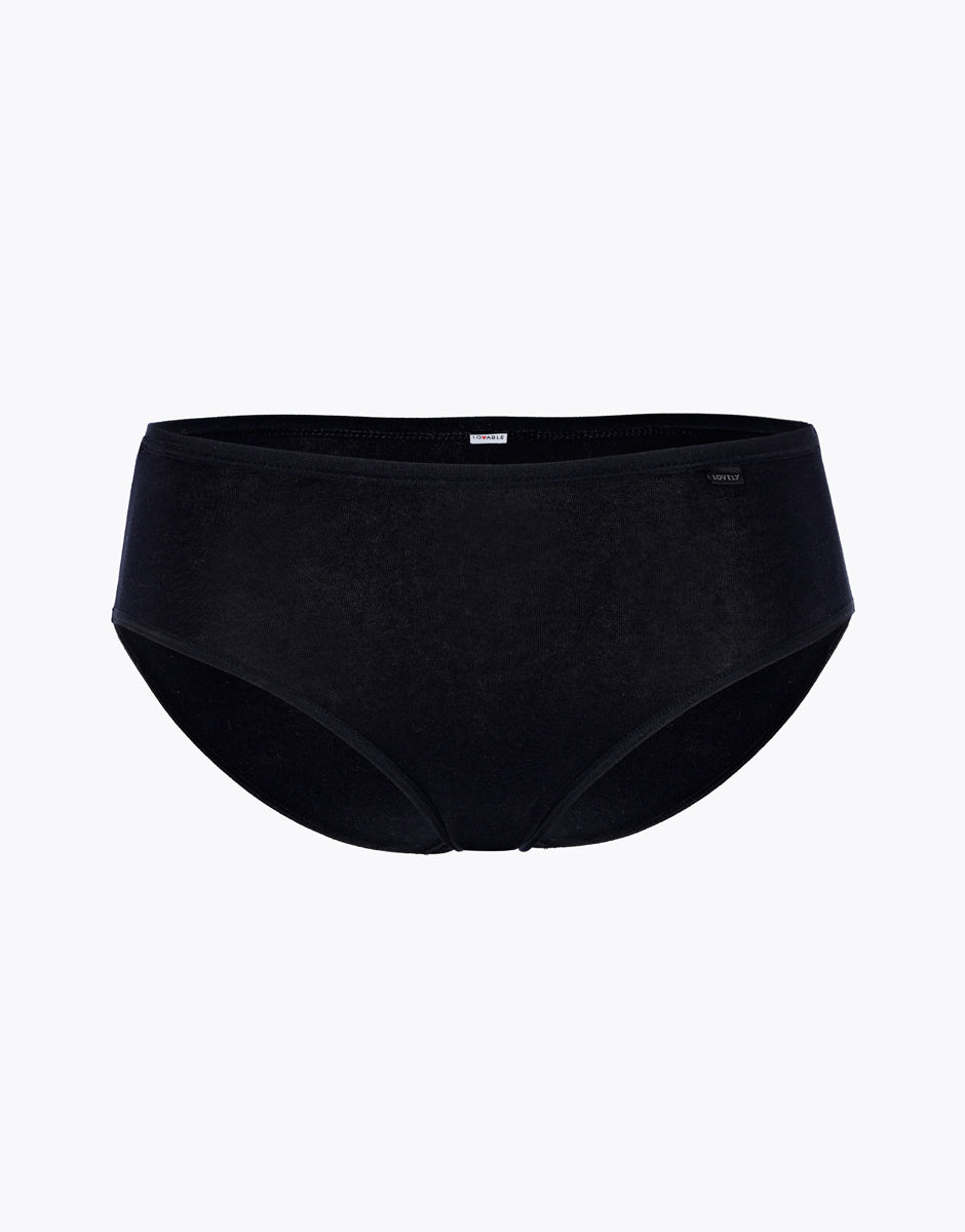 Essential modal cotton briefs in black. Featuring a snug fit thanks to its mid-rise waist and high sides, these briefs are made from modal cotton, a fiber known for its softness and breathability, perfect for everyday wear that is comfortable and gentle on the skin. In addition, the inner gusset is made from 100% cotton, while the waistband and leg openings are ultra-flat, invisible under any outfit. Finally, the lovely label on the waistband characterizes these briefs, which are a perfect blend of simplicity and comfort.