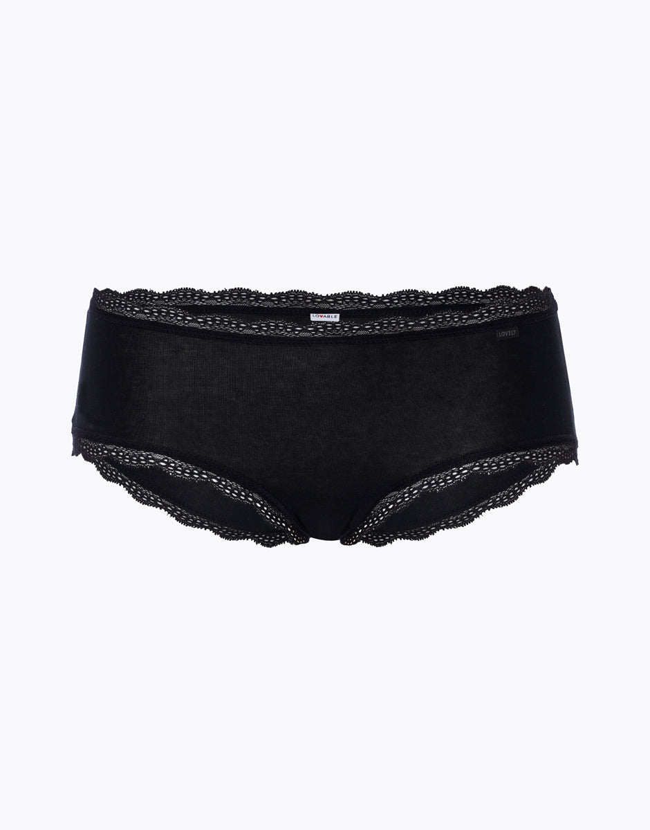 Soft stretch cotton shorty from the Lovely series in black. The model is made of stretch cotton, a fiber characterized by softness and elasticity, perfect for everyday wear. The inner gusset is made of 100% cotton and the lovely label is placed on the waistband to characterize the model. The waistband and leg openings are embellished with elastic lace trim, making the model both stylish and comfortable at the same time. Finally, the sides are snug and the leg opening at the back is pronounced. All you have to do is wear it!