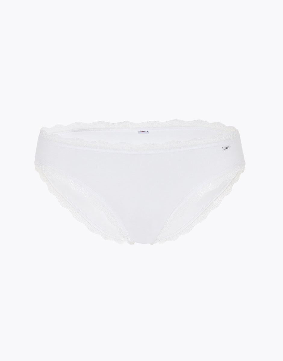 Soft briefs in stretch cotton from the Lovely series in white. The model is made of stretch cotton, a fiber characterized by softness and elasticity, perfect for everyday wear. The inner gusset is made from 100% cotton and the Lovely label is placed on the waistband to characterize the model. The waistband and leg openings are embellished with stretch lace trim, making the model both stylish and comfortable at the same time. Finally, the waist is low and the fit is really comfortable. All you have to do is wear it!