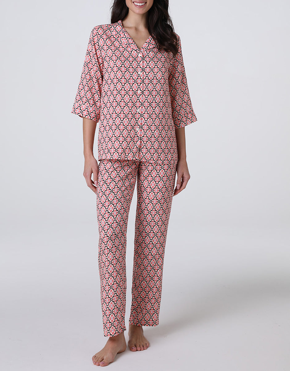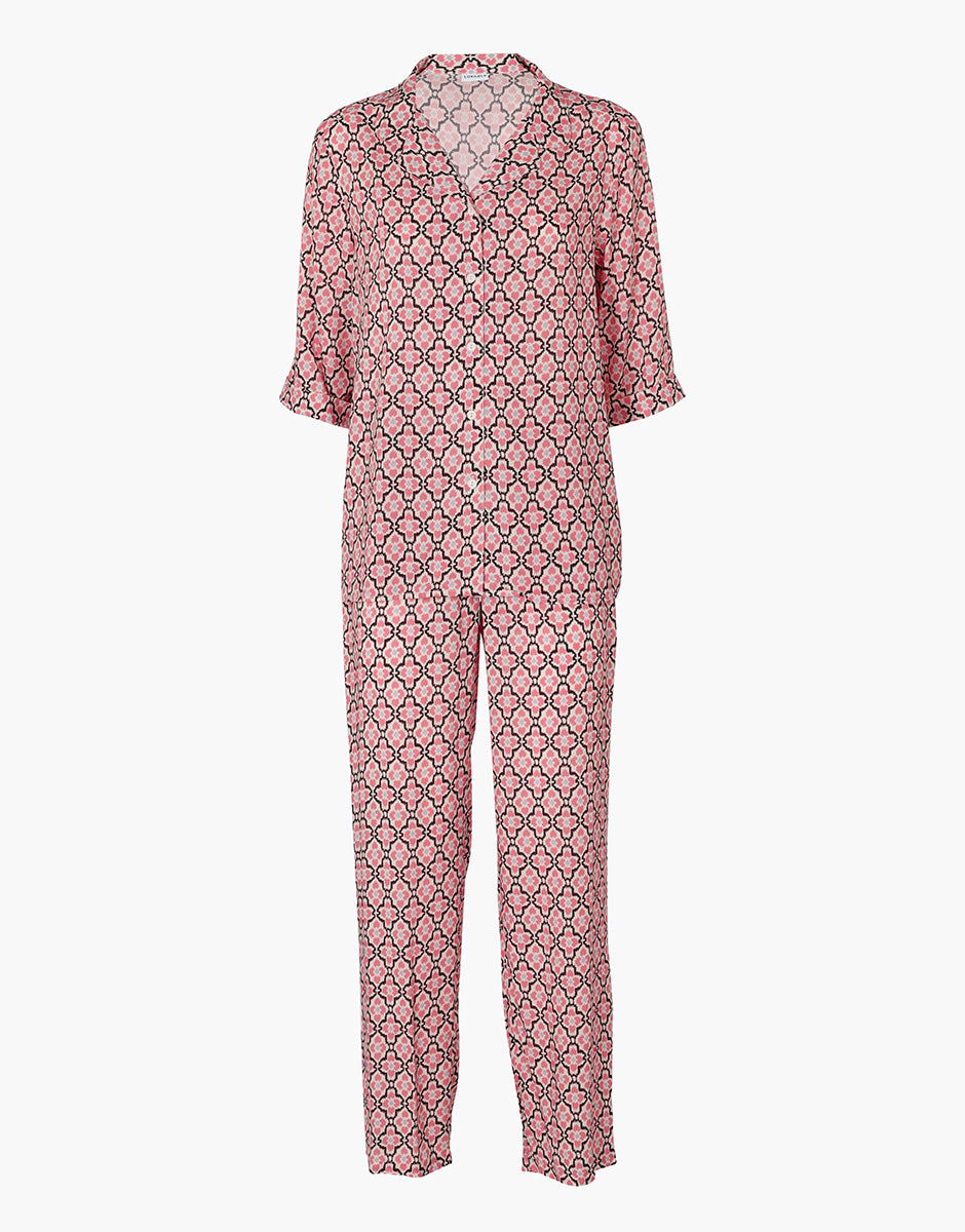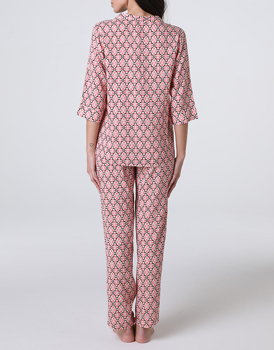 Pigiama aperto manica 3/4 in Tela di Viscosa, rosa pesco stampato