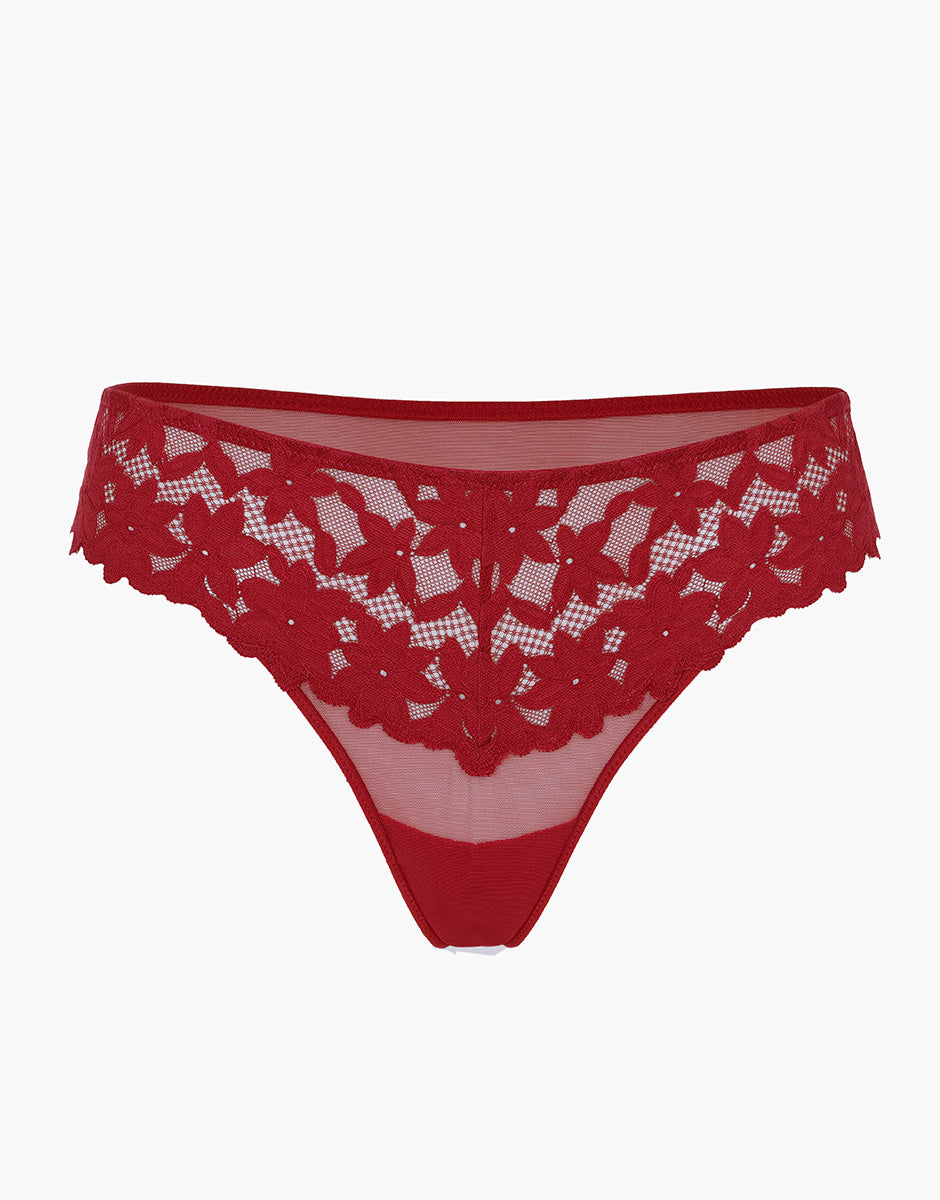 The model is 175 cm tall and wears size S.Lace thong. Lace front with center seam. Tulle back.Scalloped lace leg openings PLEASE NOTE: We recommend consulting the Size Guide on the product page to ensure you purchase the correct size for you.