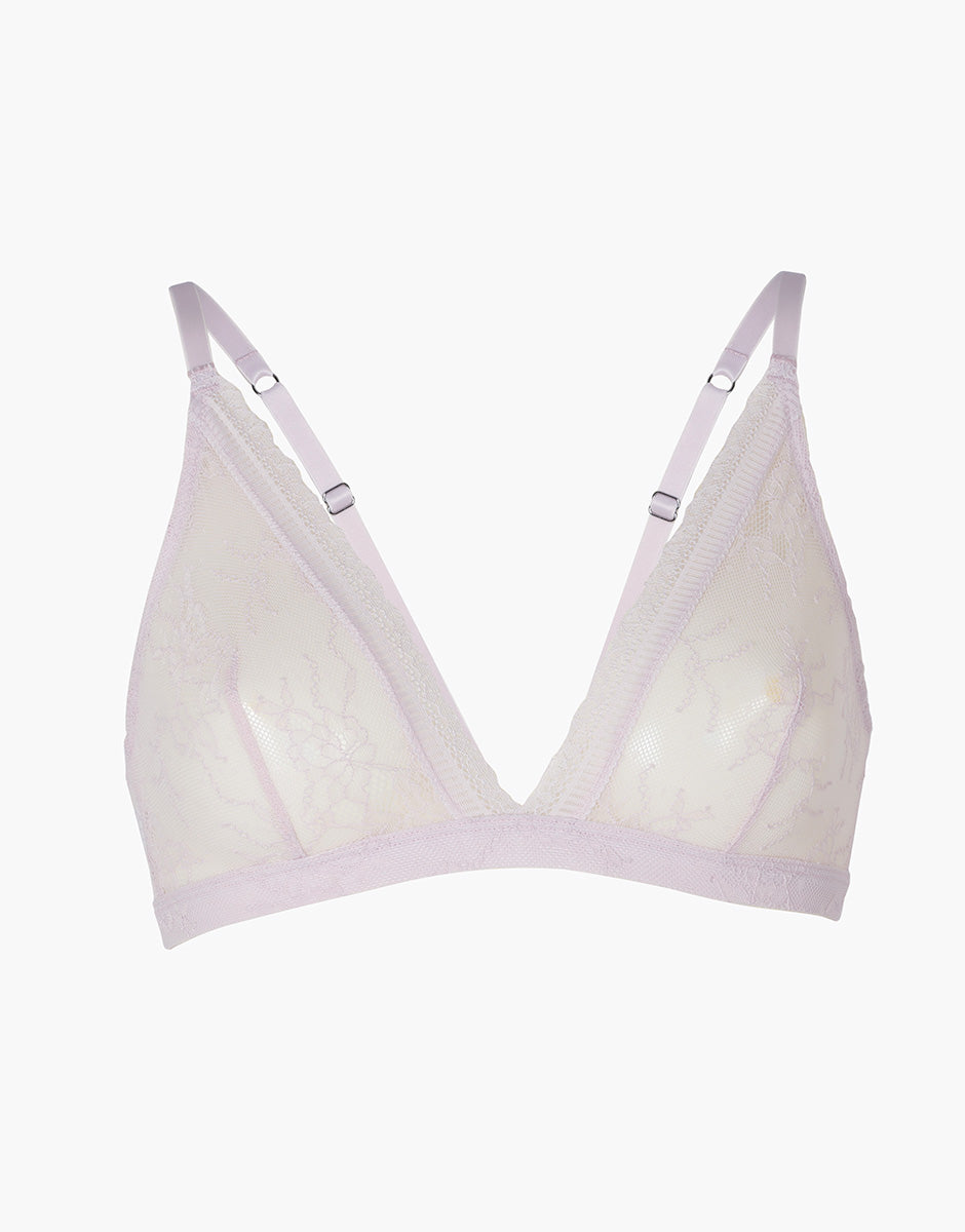 The soft cups with darts adapt naturally to the bust, while the lace-covered underbust elastic ensures a light and comfortable fit. The pastel lilac color adds a soft and contemporary touch, perfect for those looking for lingerie that enhances with discretion. The thin adjustable straps with silver rings and sliders complete the look with a bright and functional detail.A wireless bra designed for those who want freedom of movement, comfort, and a feminine style to wear every day. Discover the Romance Lace triangle bra, perfect for natural, everyday elegance.The model is 175 cm tall and wears size S.