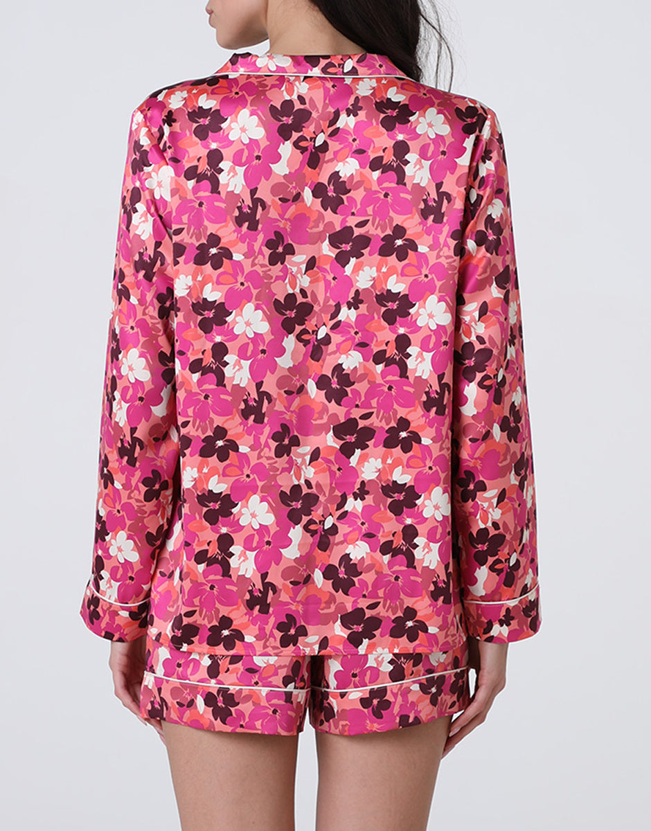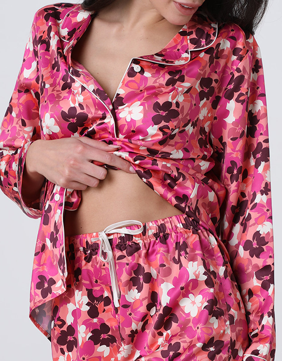 Add a touch of style and comfort to your nightwear wardrobe with these satin shorts featuring a delicate floral pattern in vibrant shades of fuchsia pink. The lightweight, soft fabric ensures a comfortable and pleasant fit for moments of relaxation.