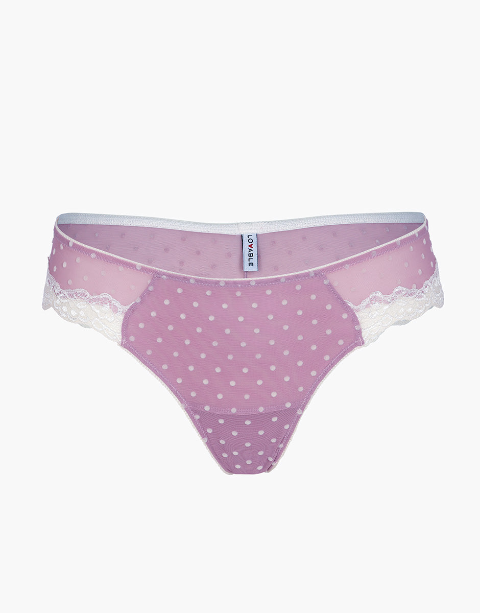 Velvet Tulle Brazilian briefs in lace and tulle, pink with ivory polka dots