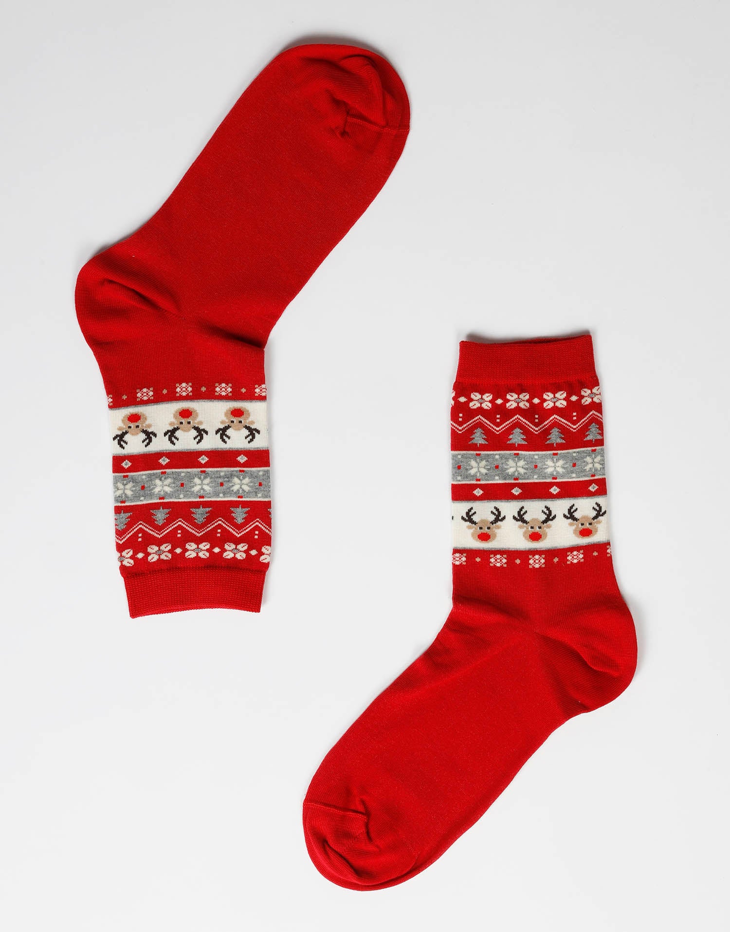 Red socks with Christmas pattern, soft and comfortable. The perfect detail for a special Christmas.